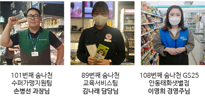 어르신이 치매로 길을 잃어버렸을 때 점포에 계시게 하여 무사히 가족을 찾아주신 분, 딸이 전화로 급하게 금전을 요청한다고 어떻게 하면 되는지 묻는 상황에 적극적으로 확인하여 보이스피싱 당할 뻔한 사례를 예방하신 분, 평소에 남몰래 개인 봉사활동을 펼치는 분, 꾸준한 헌혈로 코로나로 힘든 시기에 많은 나눔을 주시는 분...