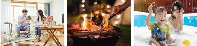 집안에 작은 텐트 또는 해먹을 치고 캠핑 장비로 야외에 온 듯한 분위기를 연출해보는 건 어떨까요? 발코니나 테라스 같은 야외 공간이 있다면 작은 바비큐 시설 하나만으로도 휴가 기분을 낼 수 있으며, 아이들이 있는 집의 경우 홈풀장도 좋습니다! 베란다에 간이 풀장을 설치하고 파라솔까지 준비하면 해수욕장 완성!