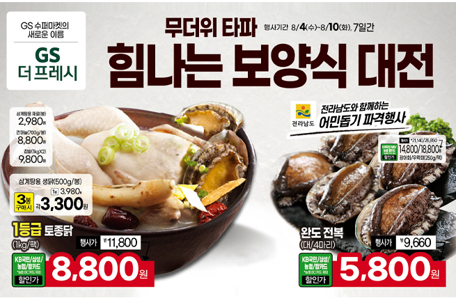 8/4(수)~8/10(화), 7일간 1등급 토종닭과 완도 전복(대/4마리)가 행사 진행합니다.
